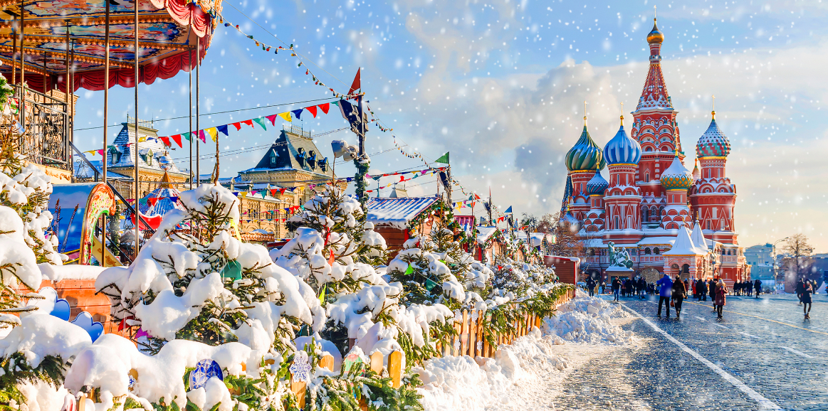 12:00 – Прогулка по Красной площади, где располагаются знаменитый каток, веселые карусели и красочные ярмарочные палатки. Внешний осмотр Собора Василия Блаженного, ГУМа и Московского Кремля.